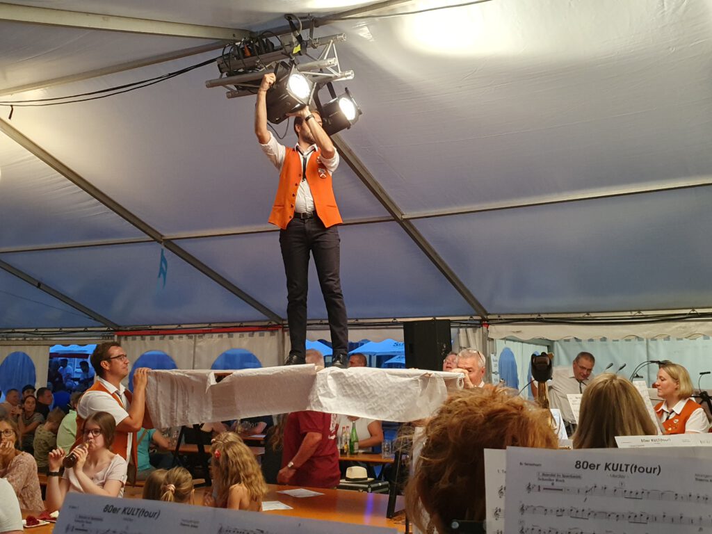 Dominik, an diesem Tag nicht nur souveräner Solist mit dem Abschlussstück Mitternachtsblues, richtete dann die Scheinwerfer, sodass wir im Innenbereich weiterspielen konnten.