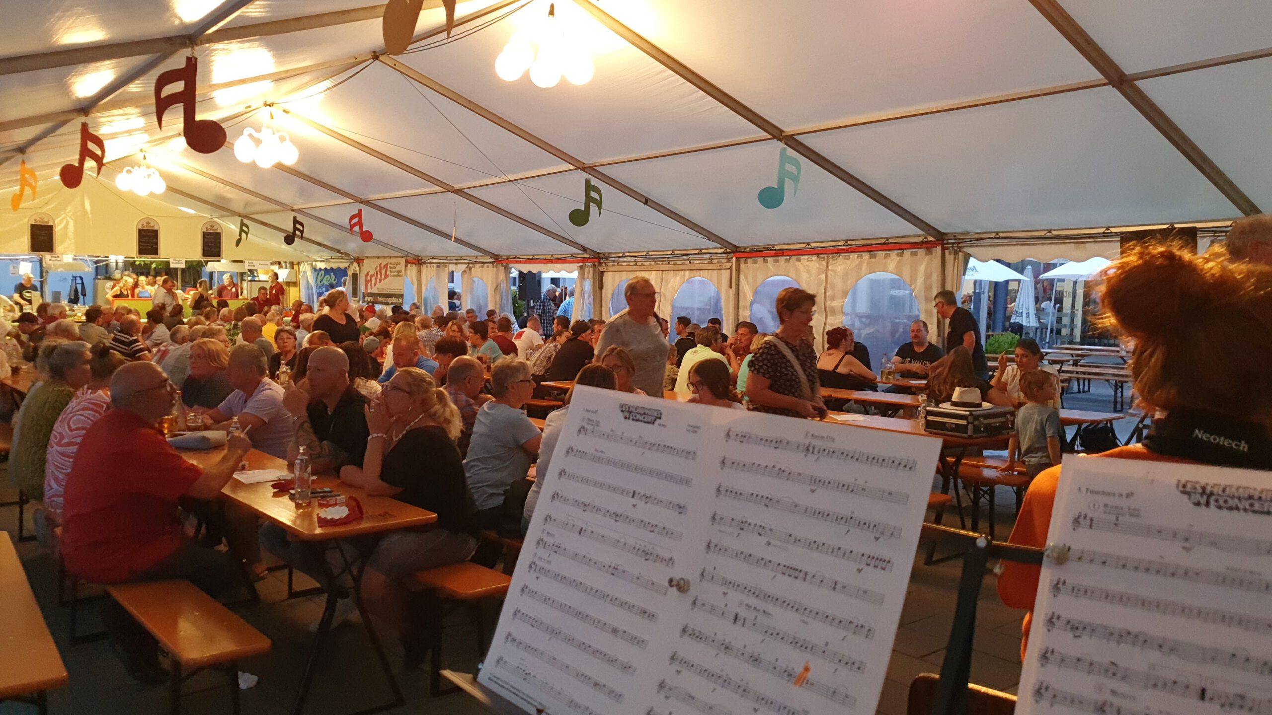 Gestartet haben wir dieses Mal im Außenbereich, da es die Leute auf Grund der heißen Temperaturen natürlich aus dem Zelt getrieben hatte. Nach ca. einer halben Stunde Spielen kam dann jedoch ein Gewitter auf. So mussten wir zurück in´s Zelt. Recht duster war´s – bis das Licht anging. Das dann aber ordentlich geblendet hatte.