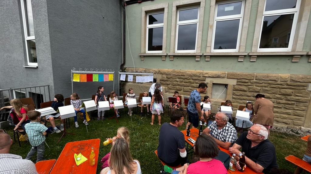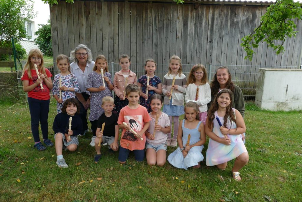 Am Samstag, 01.07.2023 hatten unsere 13 Kleinen ihren ersten gemeinsamen Auftritt mit ihren Blockflöten.